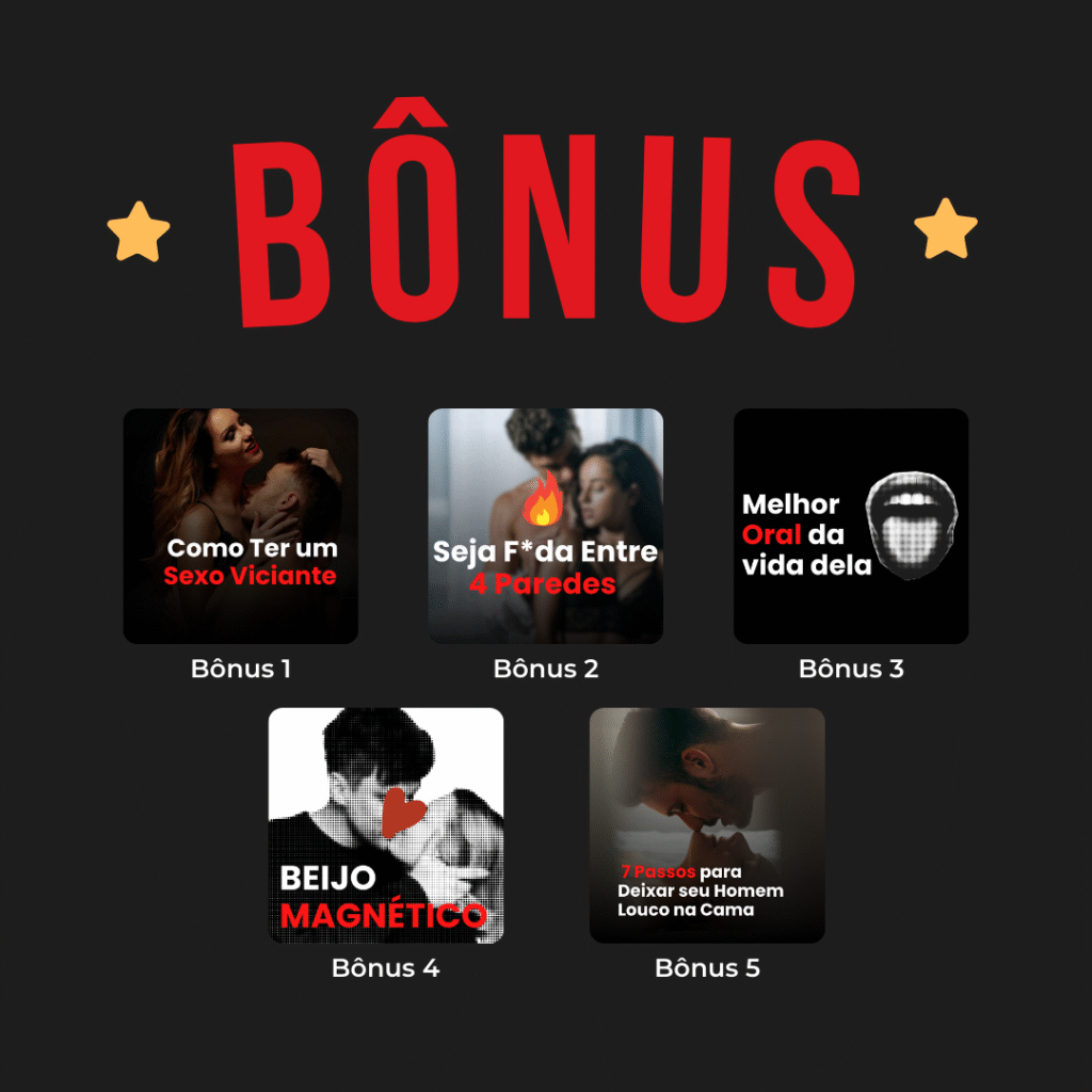 Além do Guia Completo de Massagem T*ntrica, você vai receber gratuitamente materiais extras que vão turbinar ainda mais a sua relação. Esses bônus foram criados para transformar qualquer casal em verdadeiros mestres do prazer e da conexão íntima.
